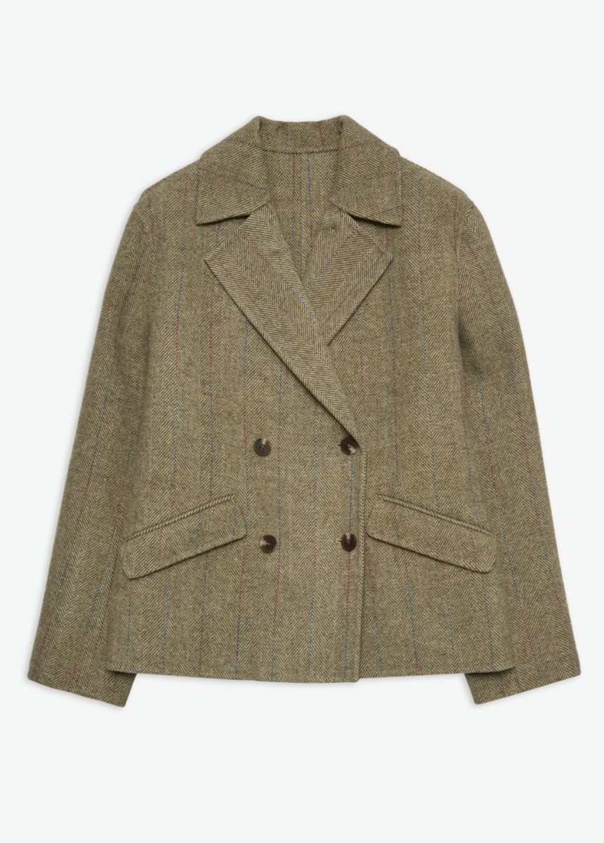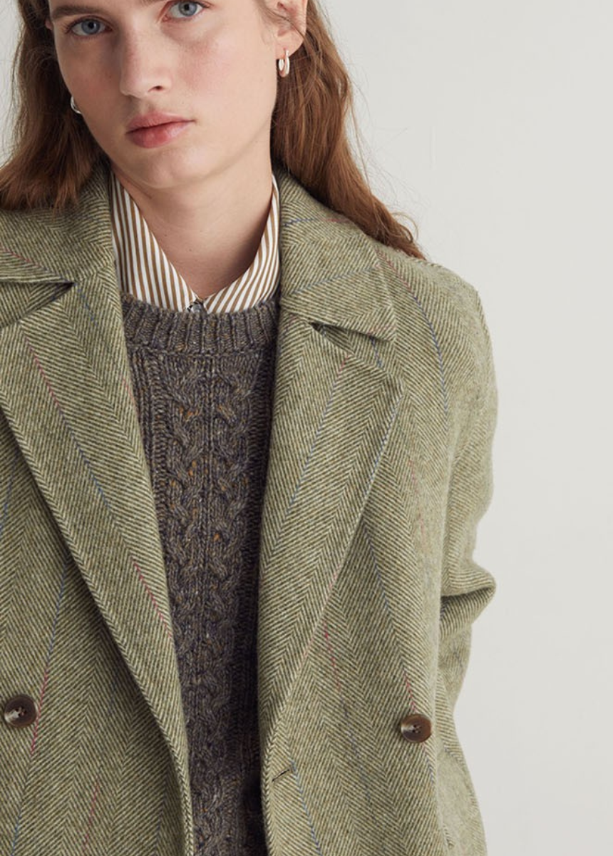 Abrigo corto cruzado. Tejido doble faz, mezcla con lana y fibras recicladas. Sin forro. Regular fit. Cuello solapa. Manga larga. Cierre con doble botonadura. Dos bolsillos frontales con solapa.