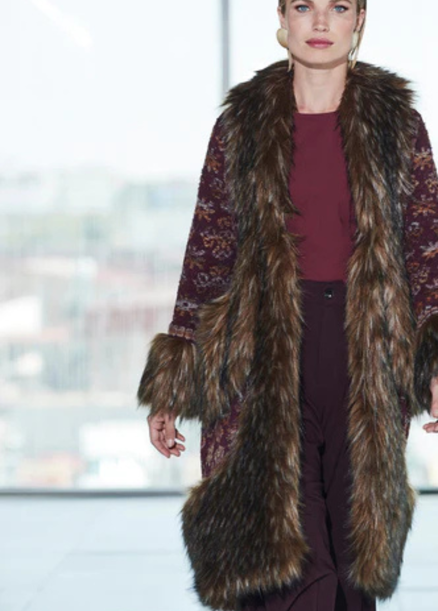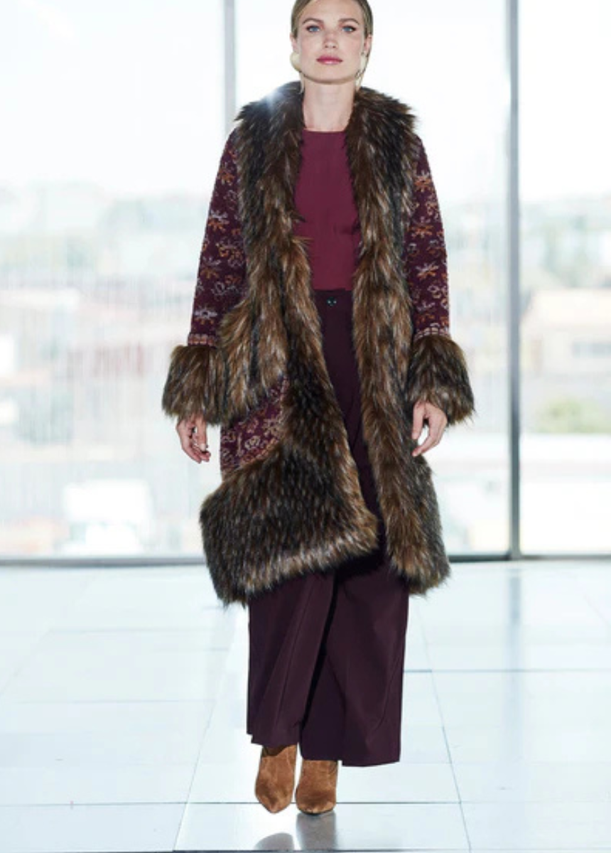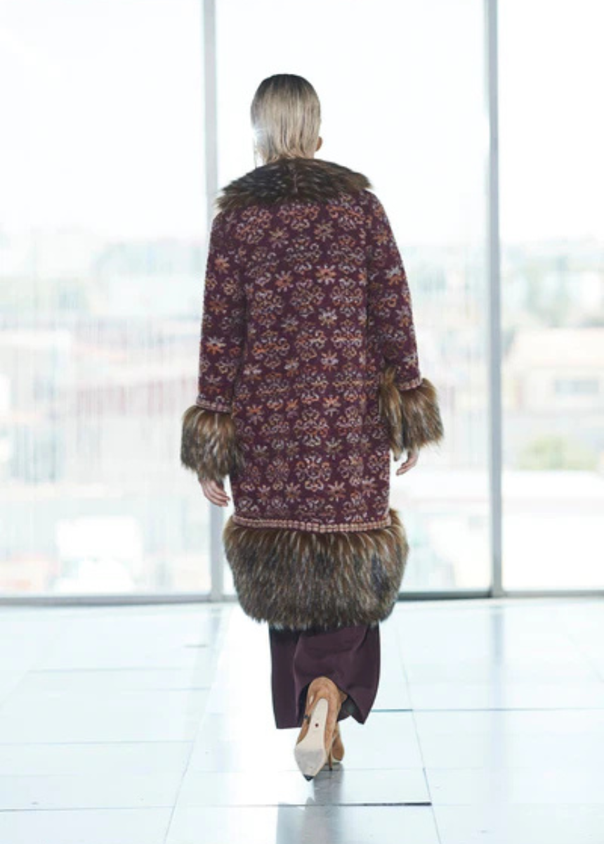 El ABRIGO LARGO JACQUARD GRANATE EMILE se alza como una pieza de arte vestible, una verdadera oda a la maestría textil. Su distintivo jacquard en bastas, donde un hilo estampado se entrelaza para crear una profundidad visual y táctil incomparable, es el corazón de su singularidad. La vagilla estampada y perchada añade una dimensión extra de riqueza, confiriéndole un tacto sublime y una presencia inconfundible. Este abrigo largo jacquard granate no es solo una prenda que abriga; es una declaración de intenciones.