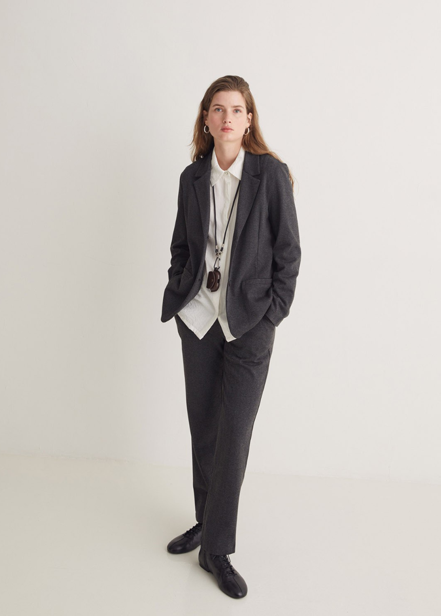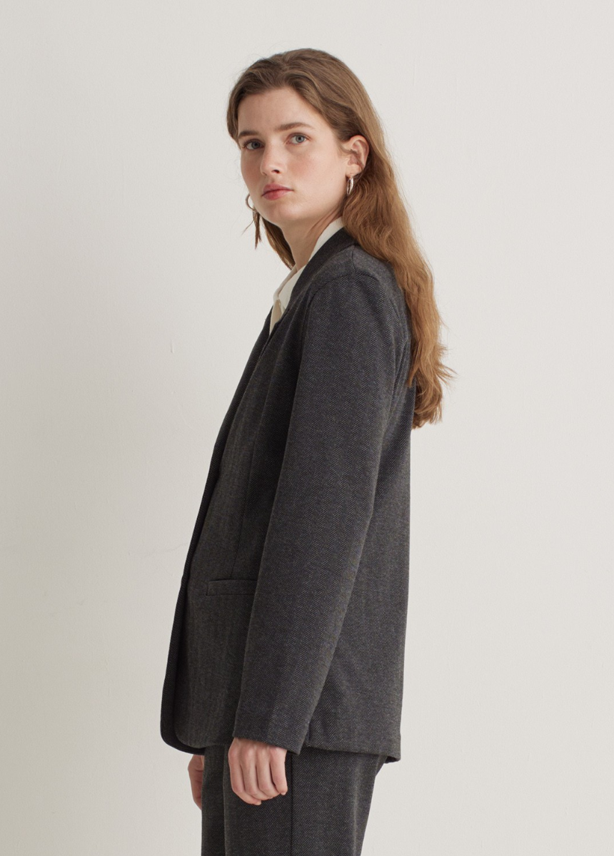 Blazer de punto. Tejido de espiga. Regular fit. Cuello solapa. Manga larga. Cierre frontal con 2 botones. Dos bolsillos frontales de vivo.