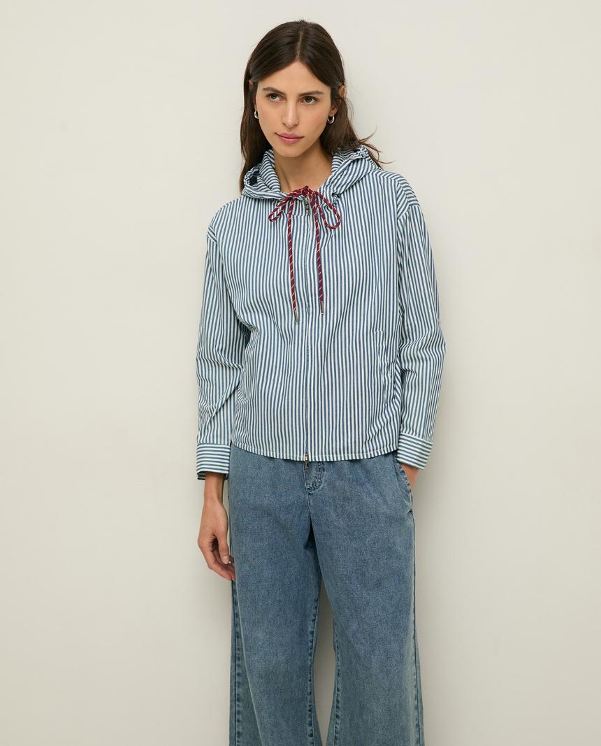 Chaqueta ligera elaborada en algodón. Diseño de rayas verticales de color blanco y azul. Con capucha ajustable mediante cordones a contraste y cierre de cremallera con doble abertura. Bolsillos laterales. Longitud desde el hombro: 58 cm (talla S).
