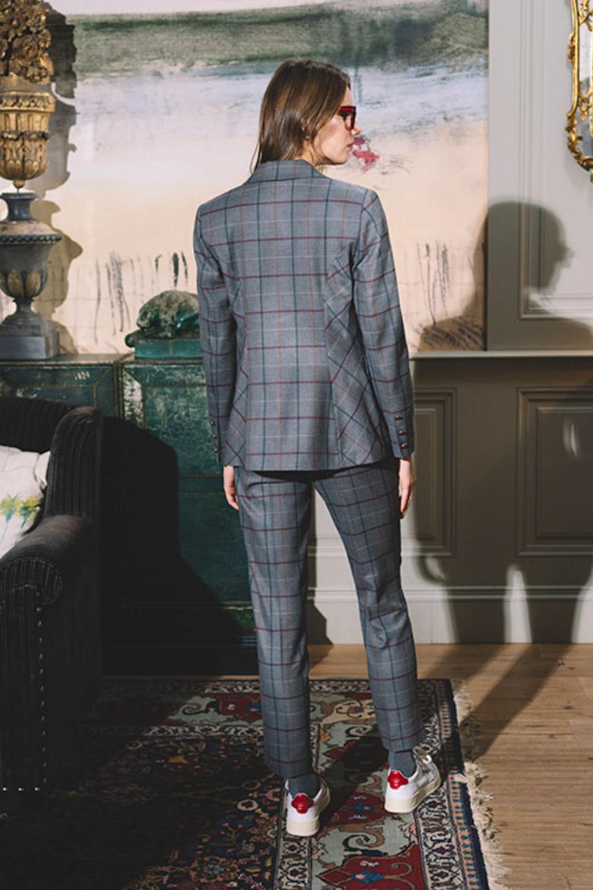 Blazer de mujer en tono gris con elegante estampado de cuadros en burdeos y azul marino. De corte sastre y diseño entallado, incluye solapas clásicas, cierre con botones y bolsillos delanteros discretos. Ideal para looks de oficina o para combinar con vaqueros y crear un outfit casual chic. Una americana versátil y atemporal que aporta sofisticación y estilo en cualquier temporada.