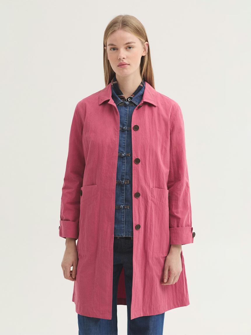 Gabardina repelente al agua confeccionada en mezcla de algodón y nailon. Presenta cuello camisero, botonadura frontal oculta y bolsillos con botón. Incluye abertura y botón en la parte trasera, y manga acabada con vuelta y botón.