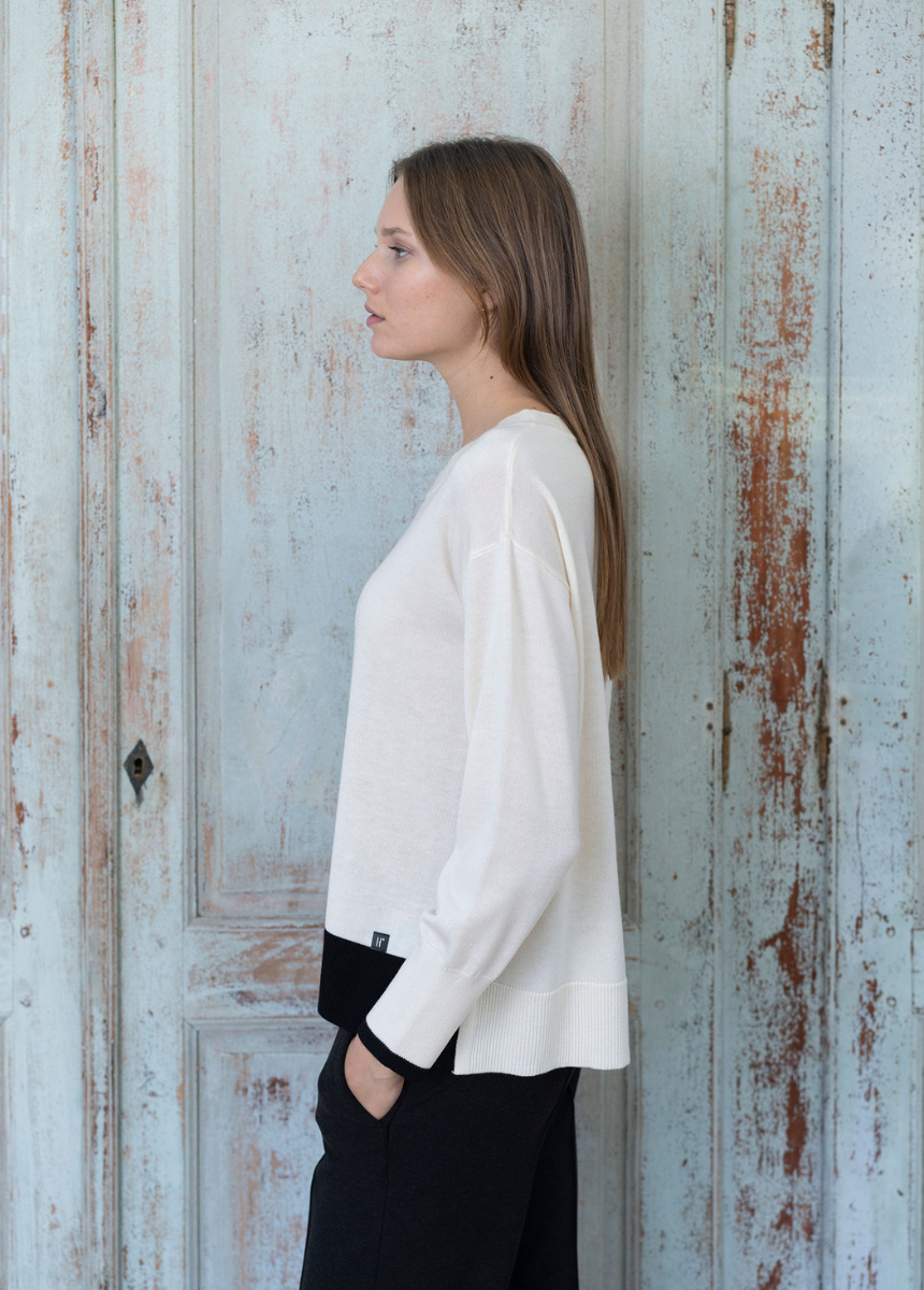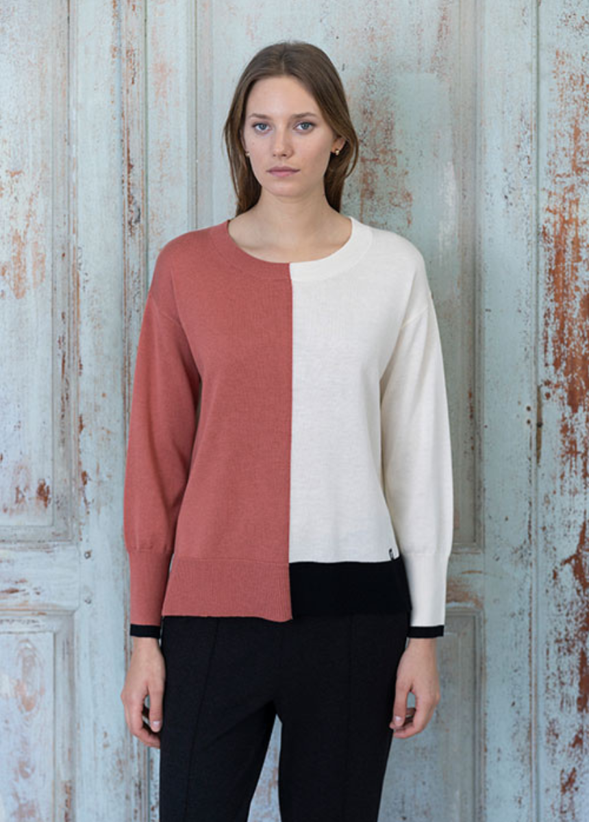 Jersey de manga larga con diseño geométrico a dos tonos, combinando terracota y marfil en el cuerpo. Presenta un contraste en negro en el bajo y en los puños, aportando un aire gráfico y contemporáneo. El cuello redondo de canalé suaviza el conjunto, mientras que su silueta recta ofrece comodidad y versatilidad. Una prenda moderna y fácil de combinar, ideal para dar un toque actual a looks casuales o de oficina.