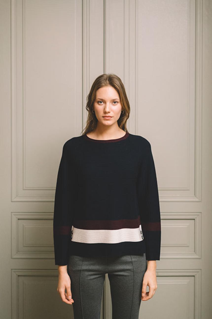 Jersey de punto fino en color beige, con cuello redondo rematado en contraste claro. Incorpora franjas horizontales en negro y crudo en el bajo y las mangas, junto con un detalle de botones laterales que le añaden un toque actual y diferenciador. De corte recto y cómodo, es una prenda versátil que se adapta tanto a estilismos casual como a looks más elegantes.