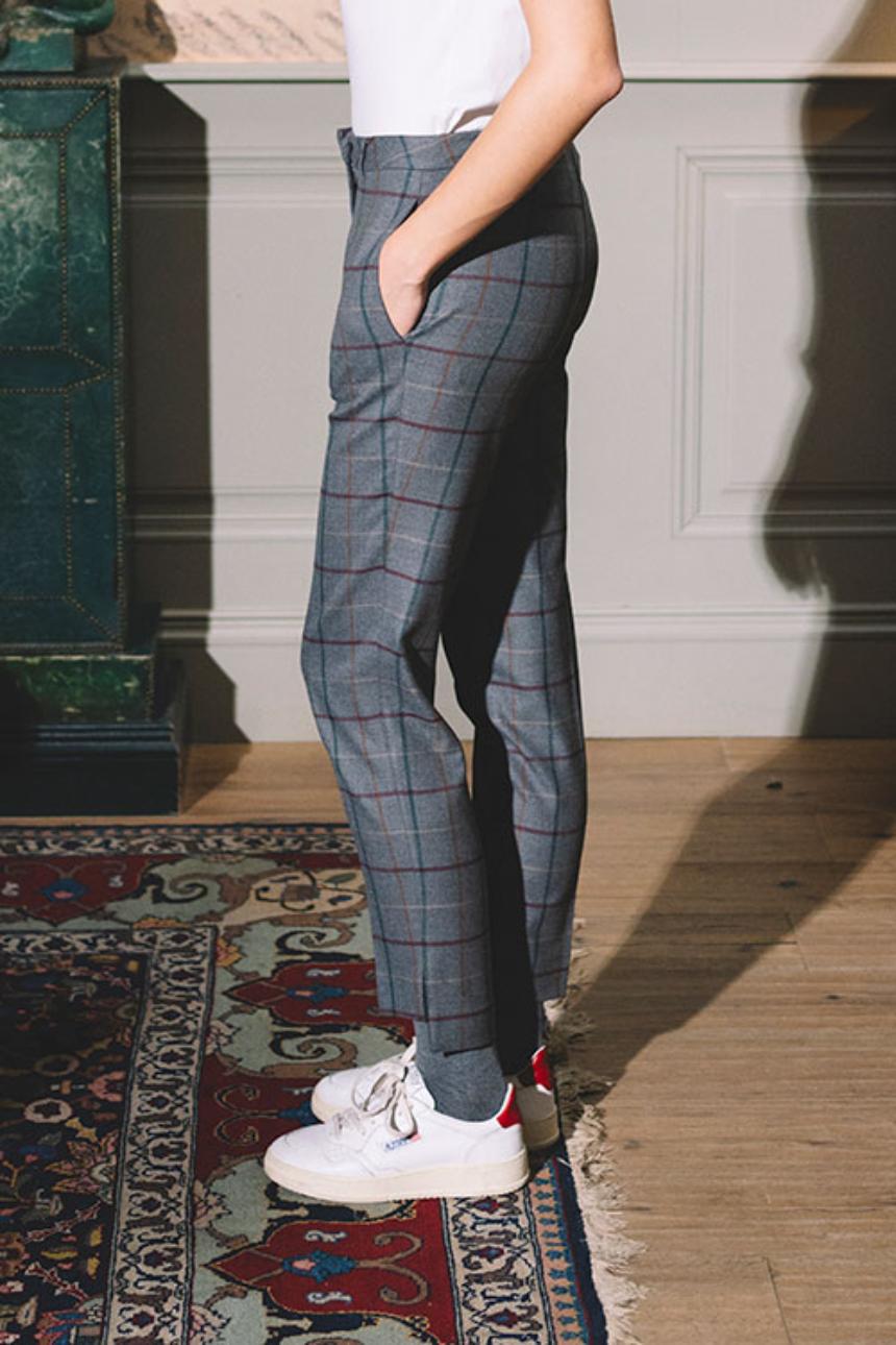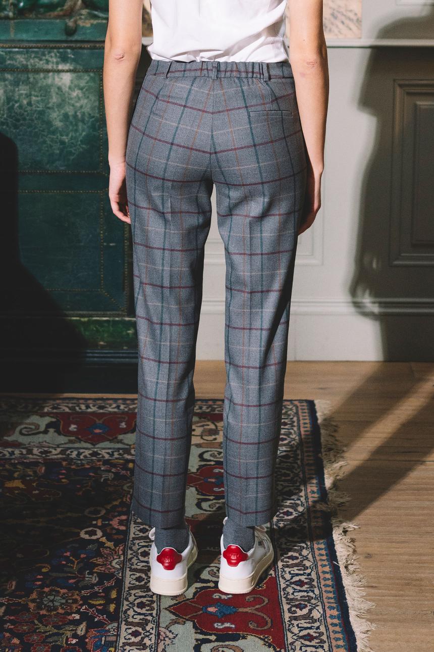 Pantalón de tiro medio en tejido gris con patrón de cuadros en tonos burdeos y azul marino. Combina un corte recto y bolsillos laterales con una cintura que incorpora goma en la parte trasera para mayor comodidad y ajuste. Su diseño versátil permite crear tanto conjuntos formales como looks casuales con un toque moderno y elegante.
