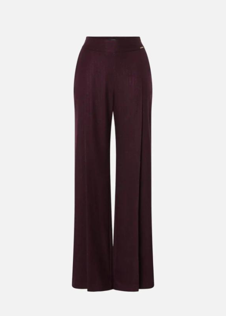 Pantalonesmarrones de tiro alto, con una raya central definitiva y pernera recta. Cuentan con un detalle decorativo dorado en la trabilla izda de la cintura.