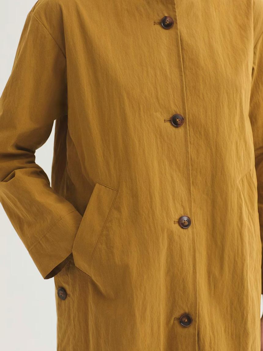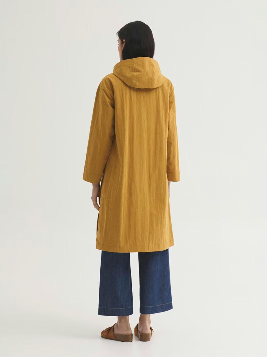 Trench confeccionado en mezcla de algodón y nailon con acabado repelente al agua. Presenta capucha, botonadura frontal y bolsillos de vivo. Incluye aberturas laterales con botones.